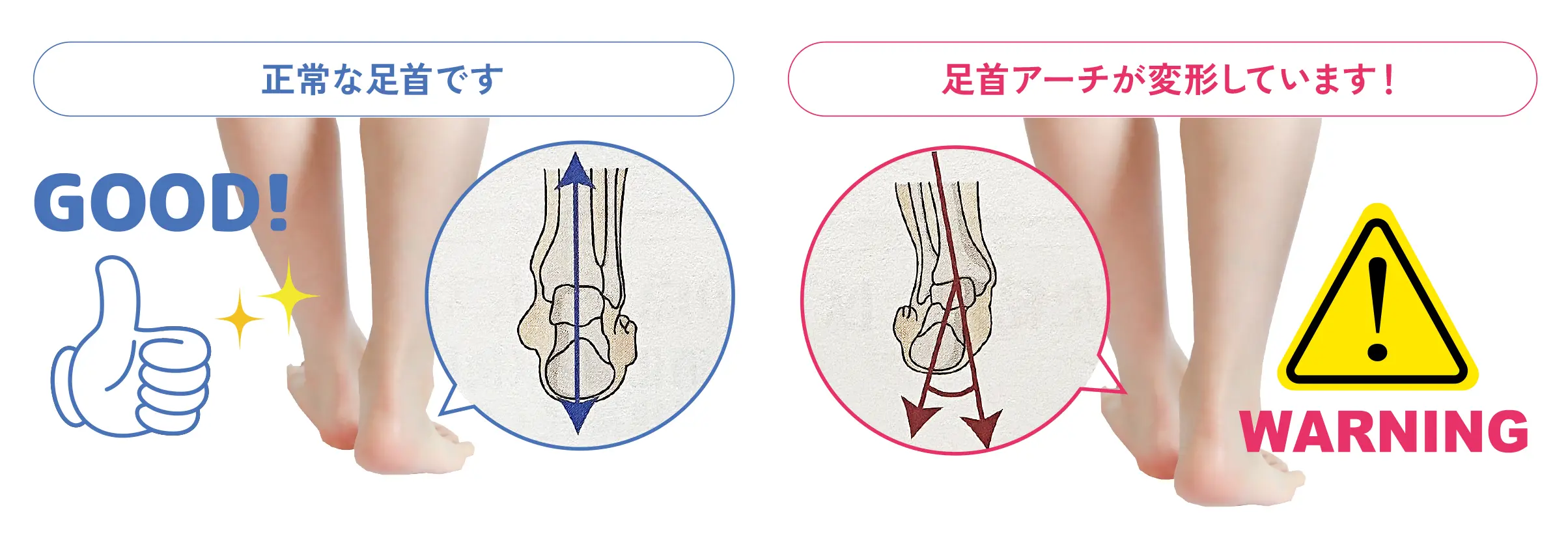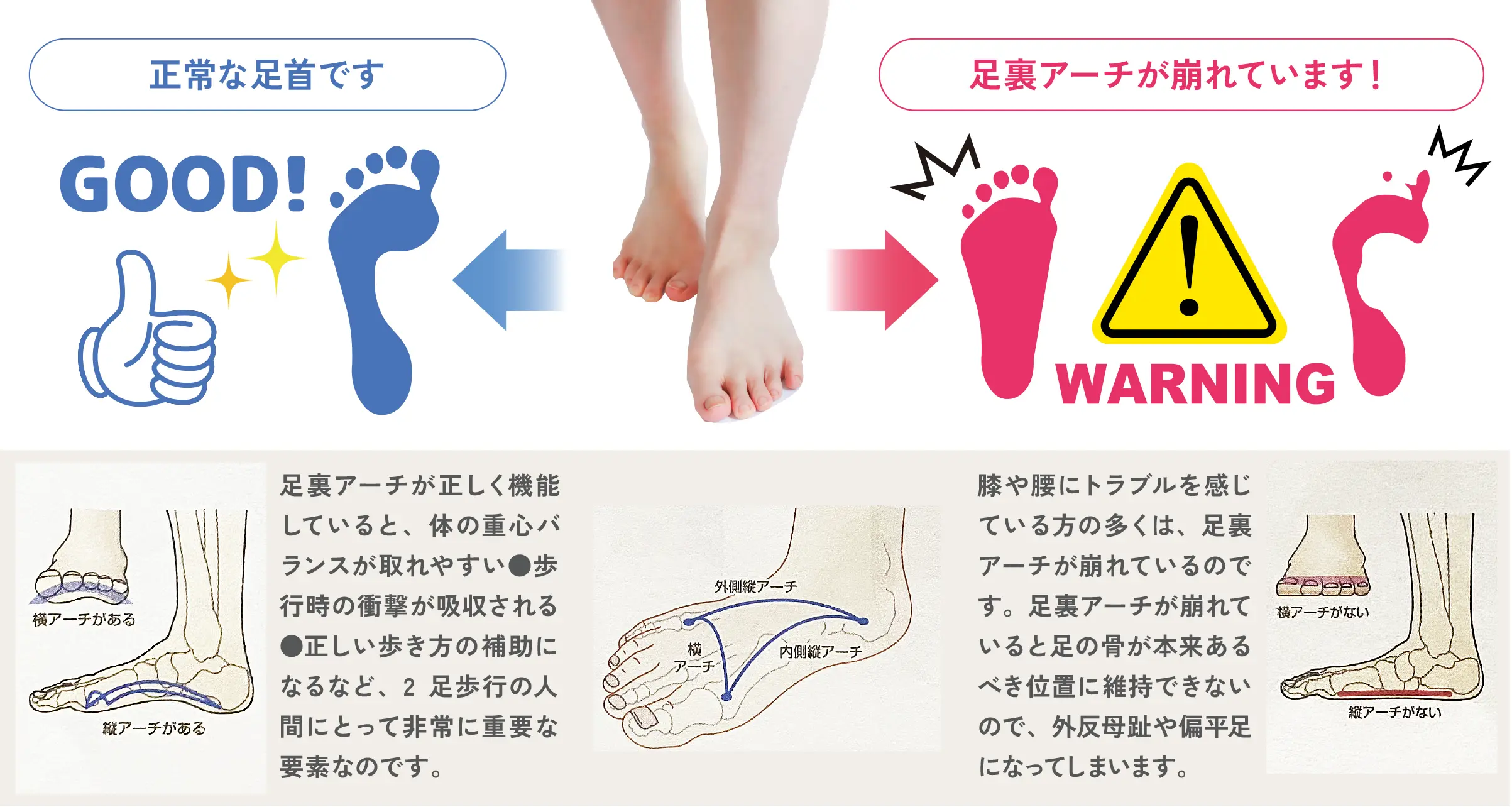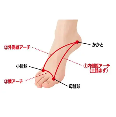 また、歩行時にかかる衝撃は体重の5〜6倍にもなりますが、アーチが あることでクッションのような役割を果たし、衝撃を和らげることが できるのです。